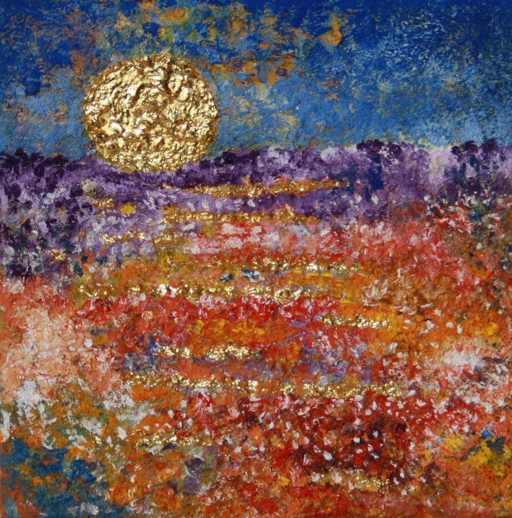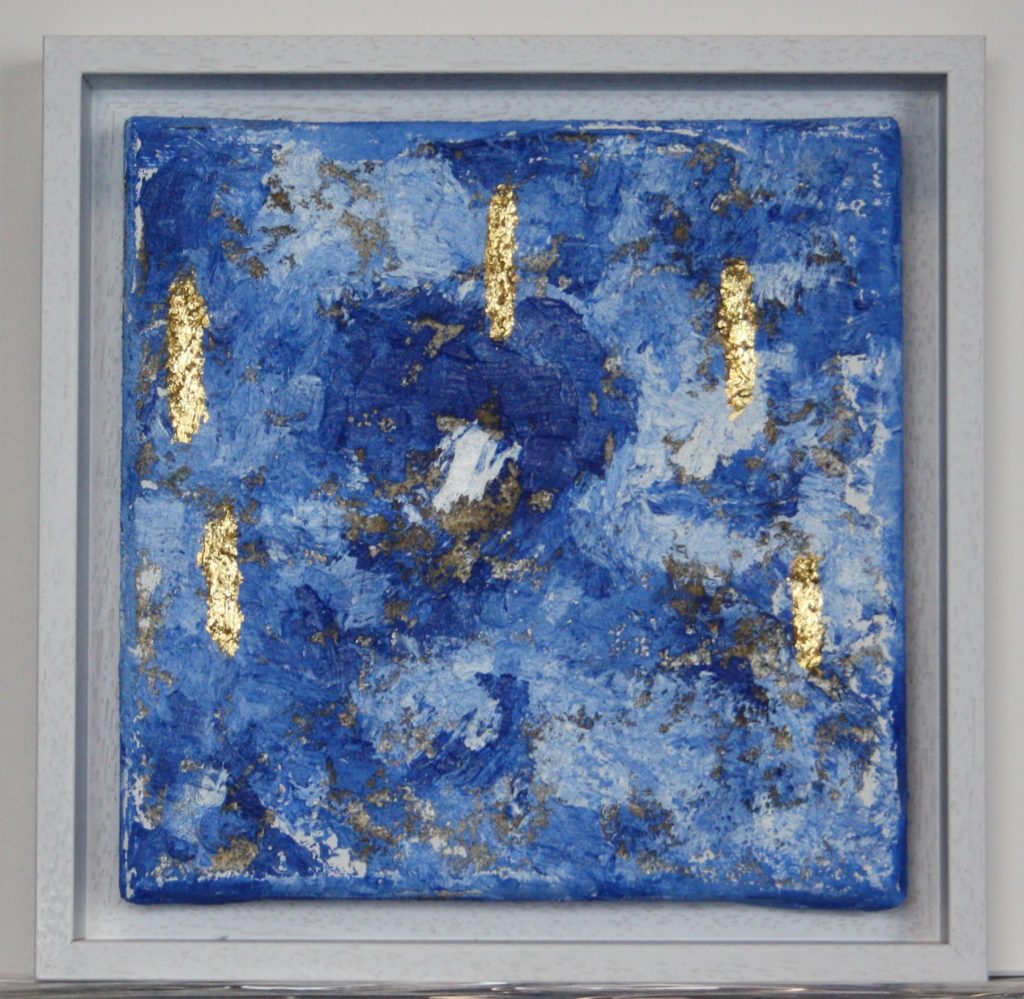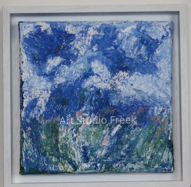 Kleine olieverfschilderijen op linnen of katoenen doek van 20 x 20 cm in een ruime witte, houten baklijst.